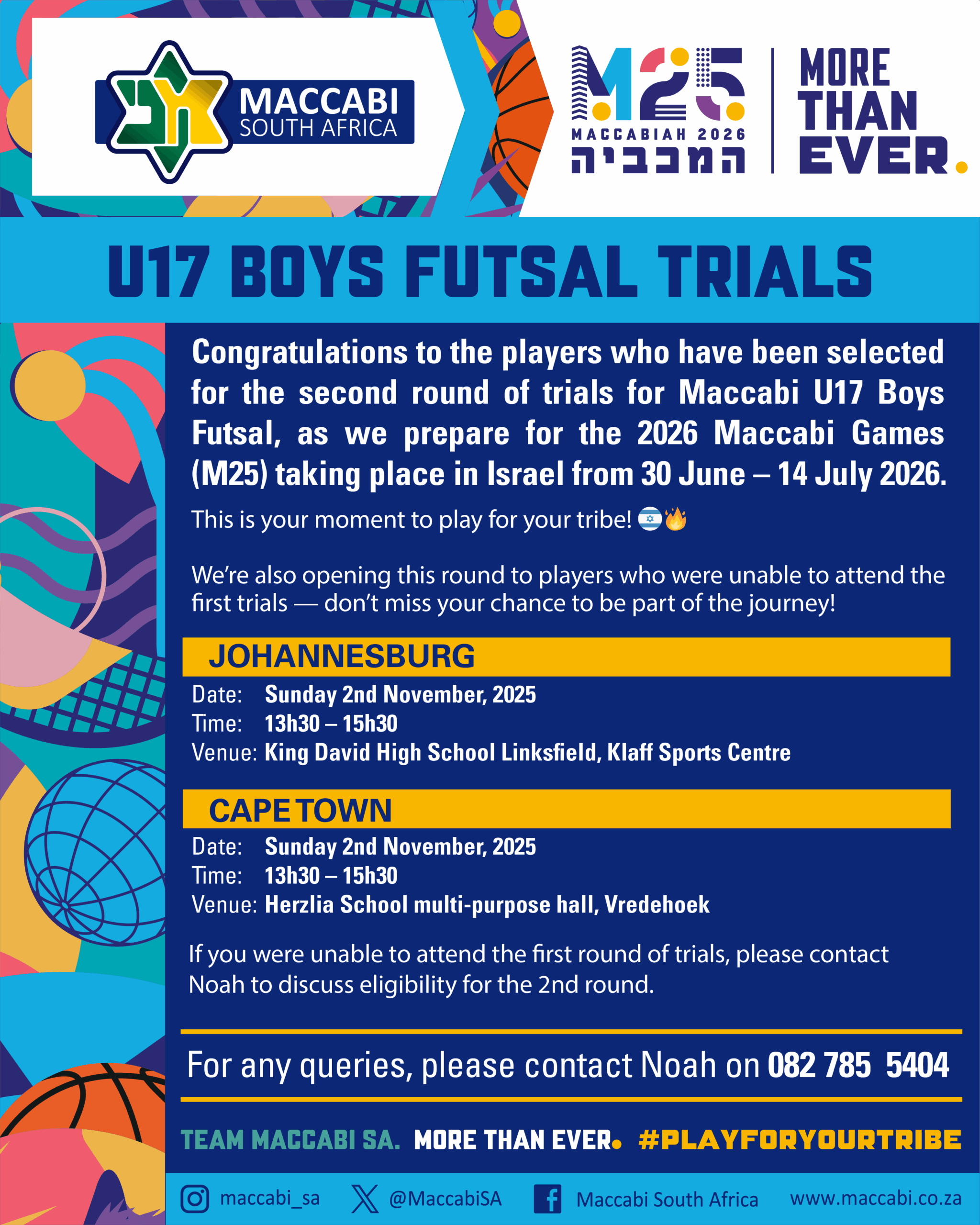 Congratulations to the players selected for the second round of trials as we gear up for the 2026 Maccabi Games (M25) in Israel, from 30 June – 14 July 2026.